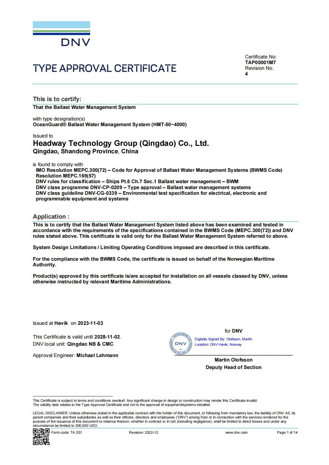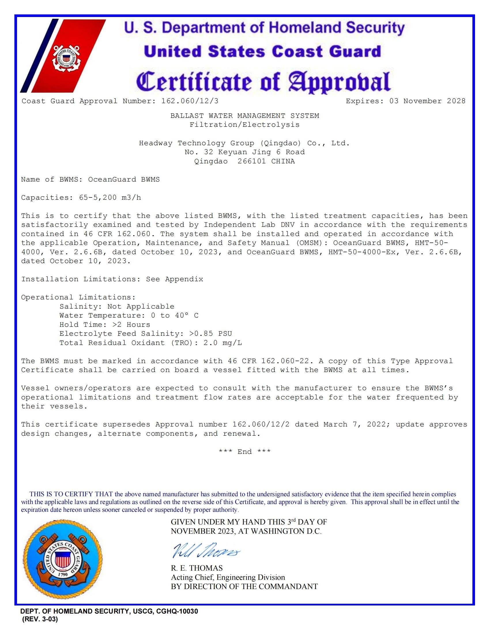 IMO BWMS Code 型式認(rèn)可證書